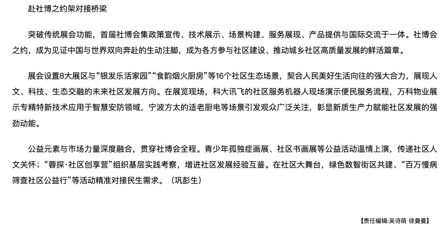 突破传统展会功能,首届社博会集政策宣传、技术展示、场景构建、服务展现、产品提供与国际交流于一体。社博会之约,成为见证中国与世界双向奔赴的生动注脚,成为各方参与社区建设、推动城乡社区高质量发展的鲜活篇章。