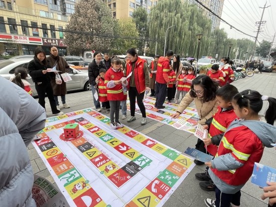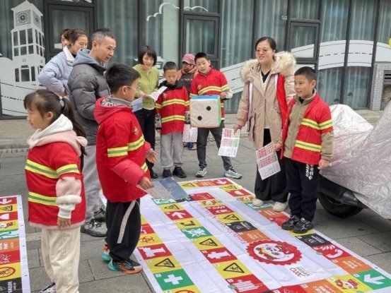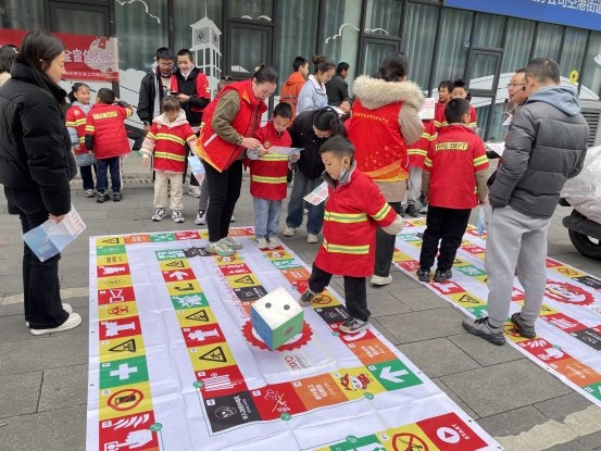 理论学习的“佐料”是充满趣味的实践环节。活动现场,一幅幅巨大的“亲子消防安全飞行棋”游戏地毯铺展开来,瞬间点燃了孩子们的热情。孩子们化身“棋子”,通过掷骰子前进,并根据格子的指令识别消防安全标识、回答消防知识问题或模拟完成报警、逃生等动作。在欢声笑语中,抽象的消防知识变成了具体可感的游戏规则,常见的禁止烟火、安全出口等标识也深深印刻在孩子们的脑海中。这种“寓教于乐”的方式,极大地激发了孩子们的学习兴趣,确保了学习效果。