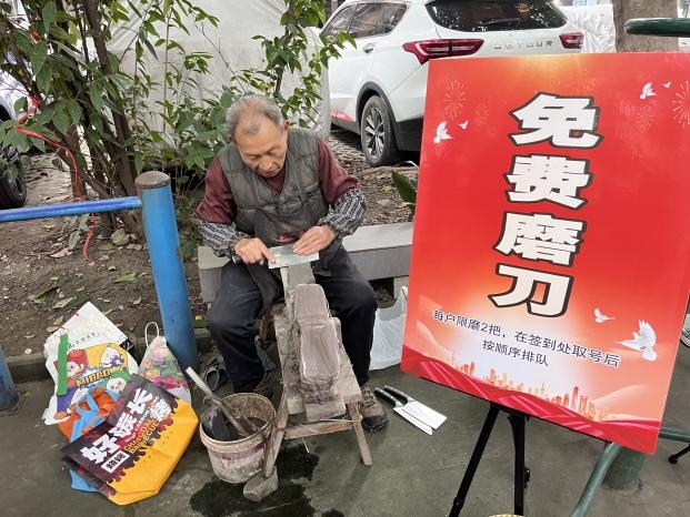 活动现场人头攒动,各项服务有序开展。在免费磨刀和理发区域,居民们早早地排起了长队,将家中钝了的刀具和需要修剪的头发交给志愿者。磨刀师傅手艺娴熟,一把把钝刀经过打磨后变得锋利如新;理发志愿者耐心细致地询问居民的需求,为他们剪出满意的发型,看着自己清爽的新发型,居民们脸上露出了开心的笑容。