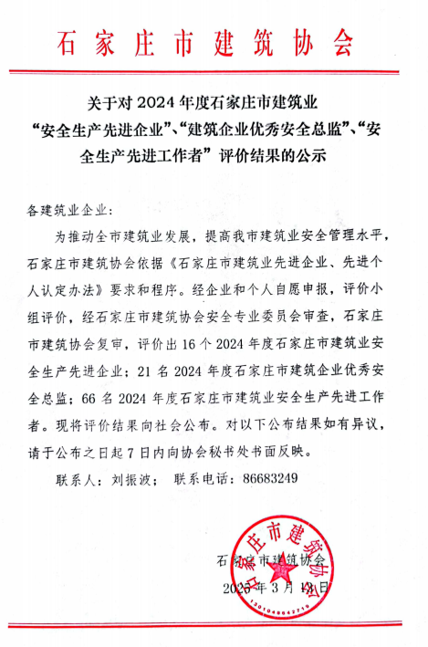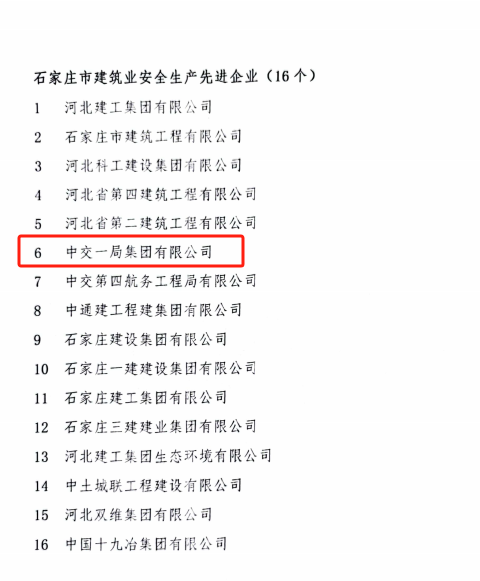 近日,石家庄市建筑协会公布2024年度“石家庄市建筑业安全生产先进企业”评价结果,中交一公局集团石家庄地铁4号线三工区项目喜获该项荣誉,这是继石家庄市A级建筑施工工地和安全文明标准化工地的又一项殊荣。同时,收获“安全生产先进工作者”与“建筑企业优秀安全总监”荣誉称号。