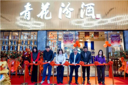 在热烈的掌声中,汾酒国际相关负责人、庞学禹董事长还与阿联酋中华工商总会第一执行会长宋弘、阿联酋湖南商会终身荣誉会长陈陵辉、光迅国际联合创始人郑丽君、拉斯海马酒窖Premium Cellars店面经理Sreejith Keekaroth等特邀嘉宾共同执起金剪,为“汾酒阿联酋体验店”启动剪彩。现场气氛庄重而喜庆,嘉宾移步店内参观,听取工作人员对汾酒酿造工艺与文化故事的细致讲解。