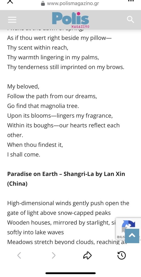 近日,国际文坛再传重磅喜讯:国际知名中国作家/诗人、意大利弗朗切斯科·詹皮特里国际文学奖(Premio Letterario Internazionale Francesco Giampietri)得主兰心(兰心萨美),其原创诗歌实现“双刊齐发”——爱情题材诗作《相约玉兰树下》与聚焦世界多元共生、和平愿景的《人间天堂——香格里拉》,同步登陆希腊权威学术期刊《Polis Magazino》(希腊语:Πόλις Μαγαζίνο)与伊拉克顶级国际文化期刊《Almanar Cultural Journal》(阿拉伯语:مجلة المنار الثقافية الدولية,中文译《灯塔文化期刊》),相关喜讯在国际广泛传播,让承载东方底蕴的中国诗意、爱的哲思与和平理想,在爱琴海与两河流域的文明沃土上双向绽放。