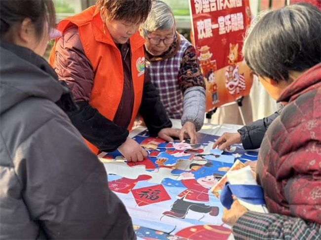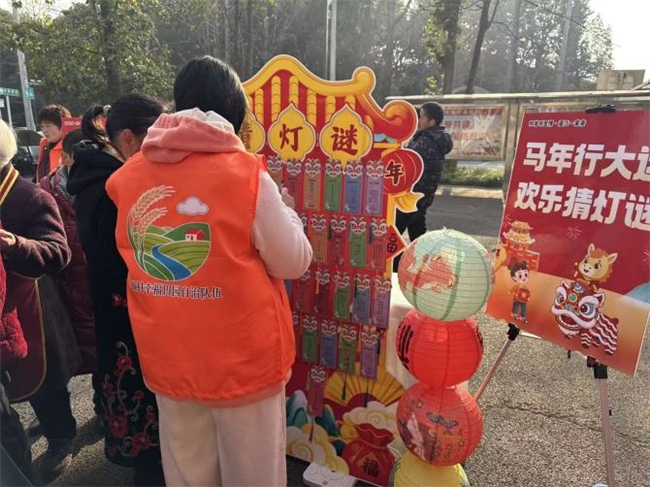 活动开场,签到游园券、新年小挂件暖心派送,活动一开场就氛围感满满!送上新春祝福后,幸福田园自治队伍成员带领大家齐练八段锦,舒展身姿间,不仅暖了身,更拉进了邻里距离。猜灯谜、合作拼图、共写斗方“福”字三个游园摊位前大家有序排队,热闹非凡:灯谜前驻足思索、拼图时默契配合、洒金红斗方上挥毫送福,每一个环节都充满欢声笑语,邻里情谊在互动中悄然升温。