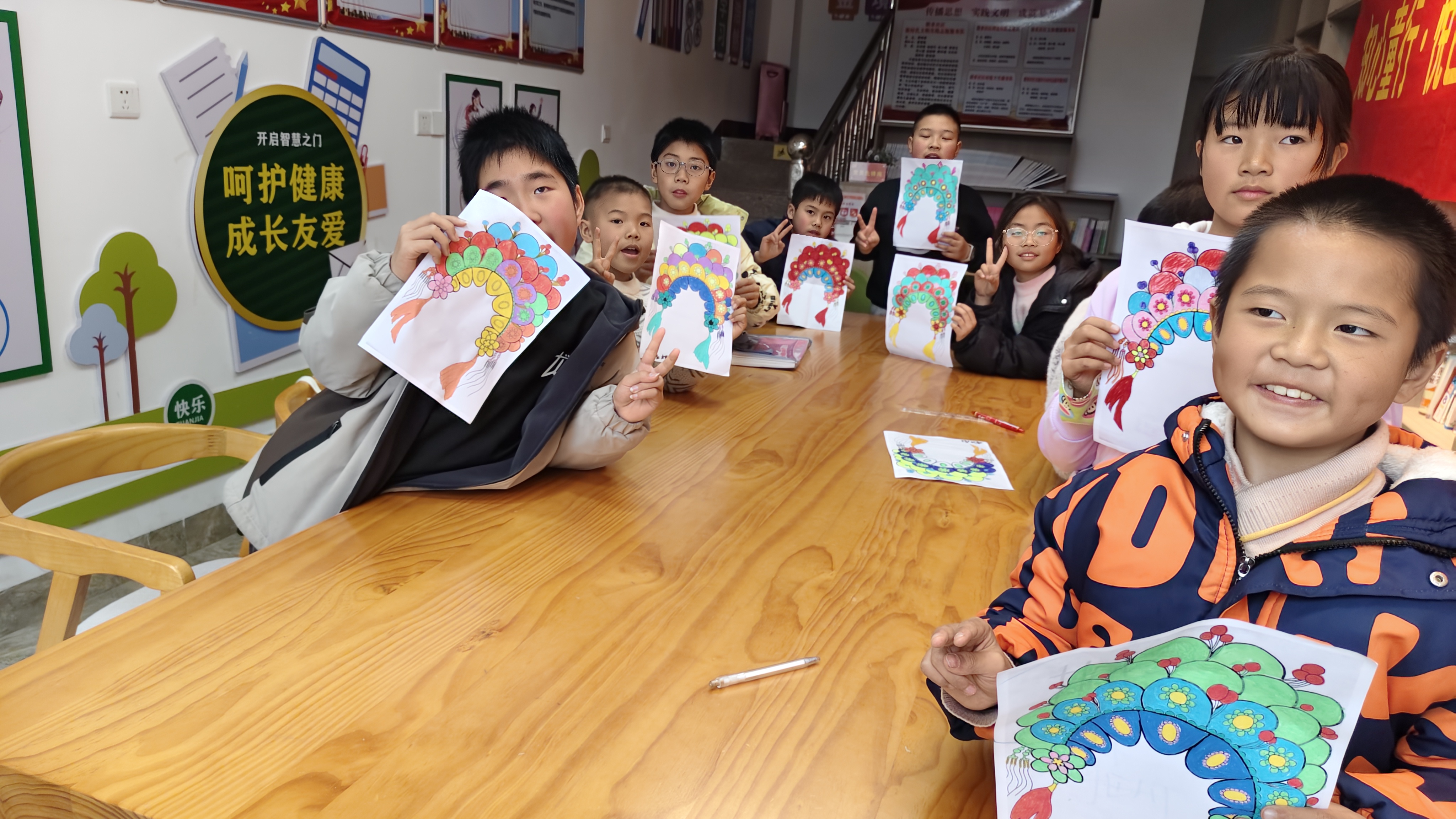 冬令营精心设计多元活动,兼顾趣味与教育意义。开营当日,社工、志愿者通过“反向指令”“花样传球”等破冰游戏,快速拉近与孩子的距离,营造温馨氛围。随后几日,国学晨读《弟子规》、毛笔书法学习,让孩子们感受传统文化魅力;“桃花朵朵开”“两人三足”等拓展游戏,提升团队协作能力,孩子们合力绘制“马年大吉长画卷”寄托新春期盼。