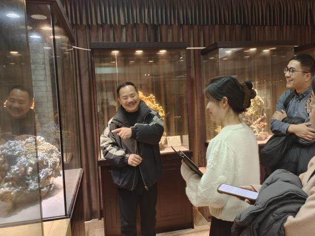 在泰顺石产业发展有限公司主任的带领下,团队成员们参观了驿站内的文化展陈。从泰顺石的地质成因到开采历史,从雕刻工具的演变到流派风格的形成,从民间工艺的默默无闻到如今的文化名片,一段段文字、一幅幅图片、一件件实物,拼凑出泰顺石雕产业发展的完整图景。目前泰顺石已开发的八大类200多个石材品种,包括独有的木纹石、类田黄石、红花石、青花瓷石等珍稀品类都可以在泰顺石文化驿站中一睹真容。主任还介绍了驿站在文化惠民、艺术普及方面所做的努力,让团队成员们看到,石雕艺术传承不仅是技艺的传递,更是文化认同的建构与生活方式的延续。