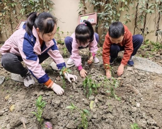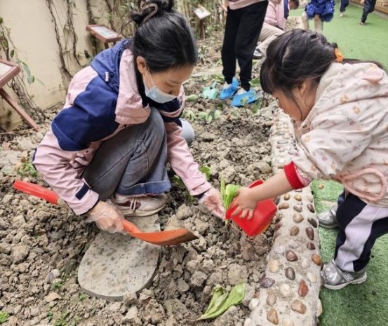 随后,孩子们在幼儿园种植区开展植树节实践。自然老师讲解植树节意义与香草、蔬菜苗栽种方法,耐心指导每一步操作。孩子们两两一组,认真完成栽种流程,不仅掌握种植技巧、体会劳动乐趣,树立护绿责任意识,更完成种植成果,以实践点缀社区、提升环境品质。
